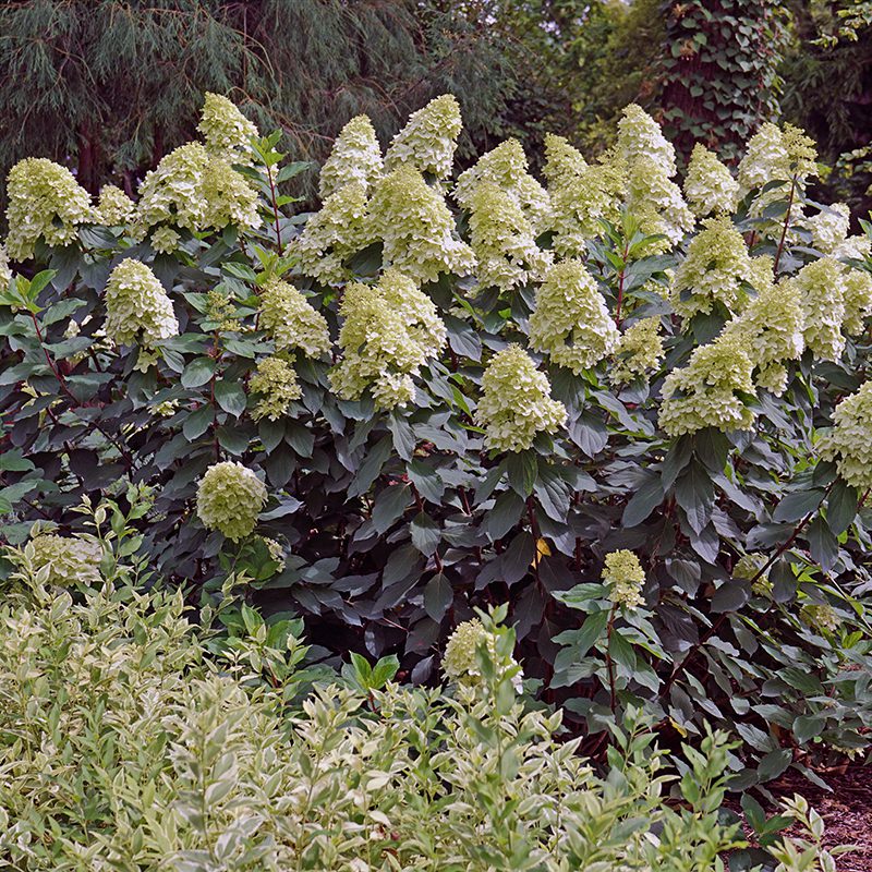 3. Hard pruning will create weaker stems. Pruning always stimulates growth, because the plant wants to replace what it’s lost. But that new growth is naturally weaker. If you prune a large Hydrangea such as a Limelight or PG back hard, it will respond with fast, upright growth that isn’t as strong. Older stems are sturdier. For the strongest paniculata stems, only remove crossed branches, and those heading into the center of the plant, aiming for removing less than 1/4 of the plant’s total size.
