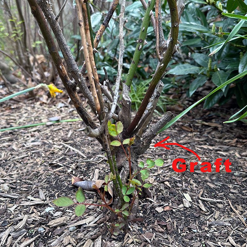 By early May you should see leaves growing on the canes of roses that made it through the winter. If you only see bare stems, and most of them are black or brown, that plant is probably dead. Sometimes you’ll see some new leaves and shoots coming from the base of a rose bush, but on most roses this growth is coming from below a graft. Most roses are grown on a hardier root-stock, but those roots will produce different size and colors of flowers; often the growth from the root stock makes long canes with red flowers. The photos below show what roses look like if they are dead, and the growth from below the graft.