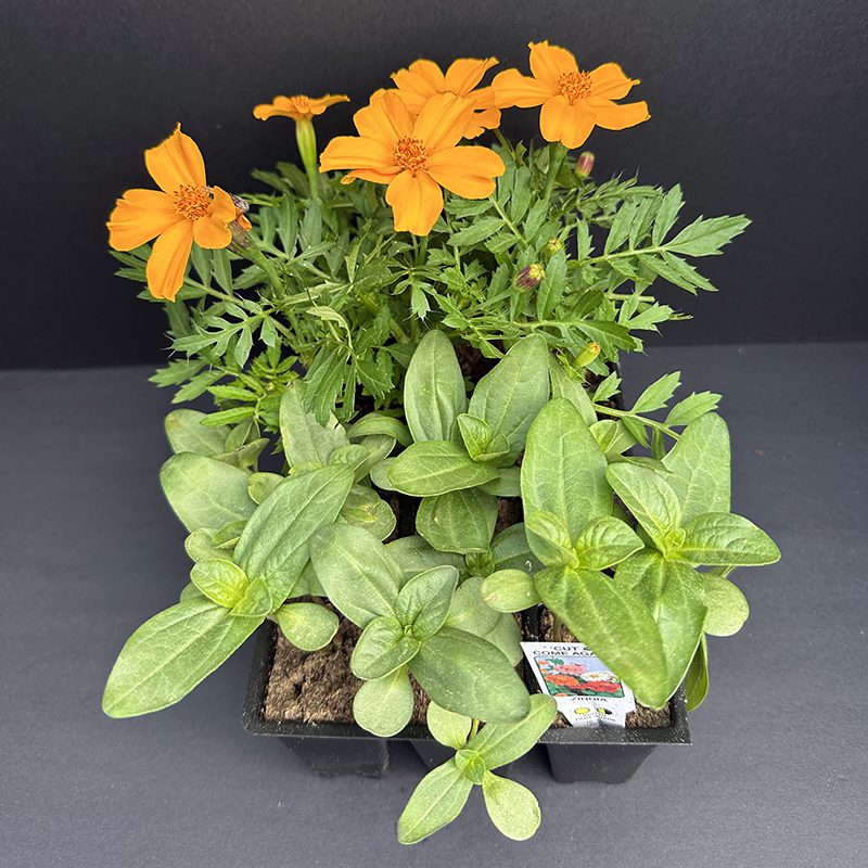 If you want to attract bees and butterflies to your pots and boxes, and you’re on a budget, use the packs of single marigolds and zinnias. Larger containers can include Cut and Come Again Zinnias, but Profusion Zinnias can be used in smaller pots or when shorter plants are needed. Be sure to get the single marigolds, pictured here, since these offer more pollen and nectar than the pompom style doubles.