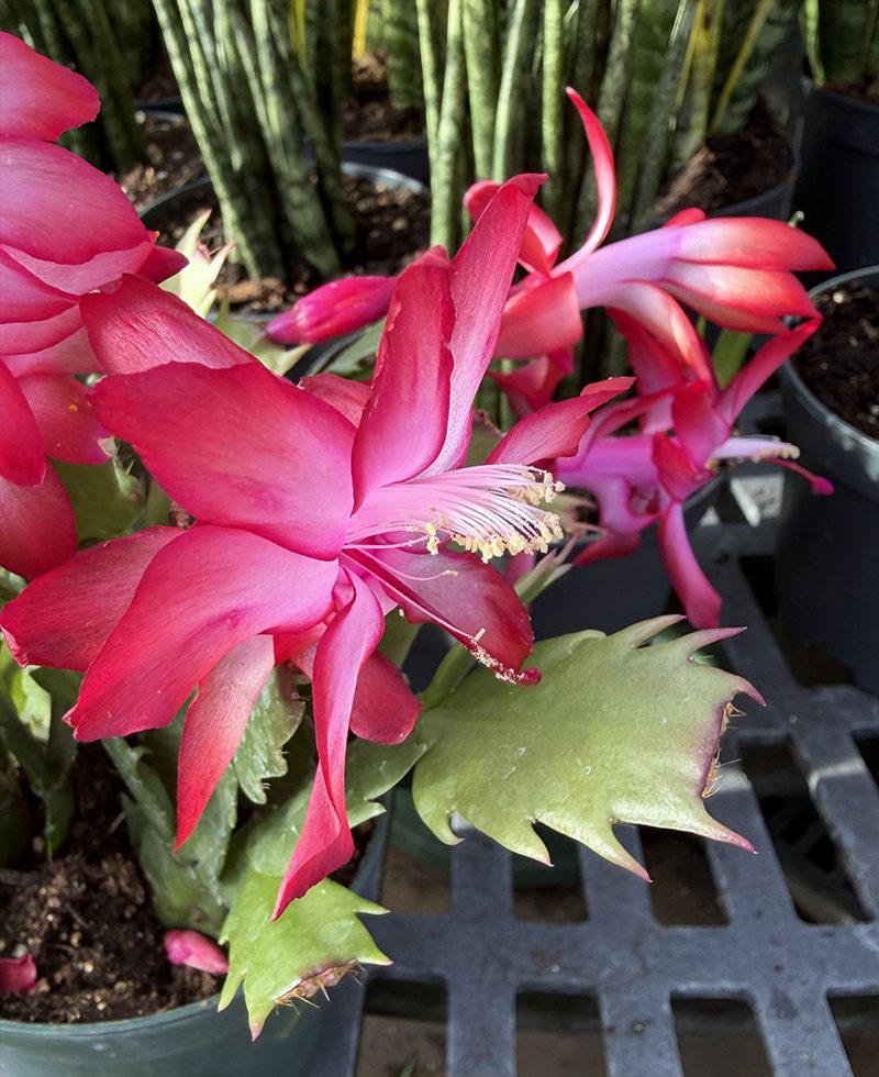 For much of the year you can find Schlumbergera plants flowering in our greenhouse. From early November through the winter, several shades of the plants we call “Thanksgiving Cactus” or “Christmas Cactus” are available. These plants are easy to grow and bring back into flower from year to year if you remember a few key points about their care.