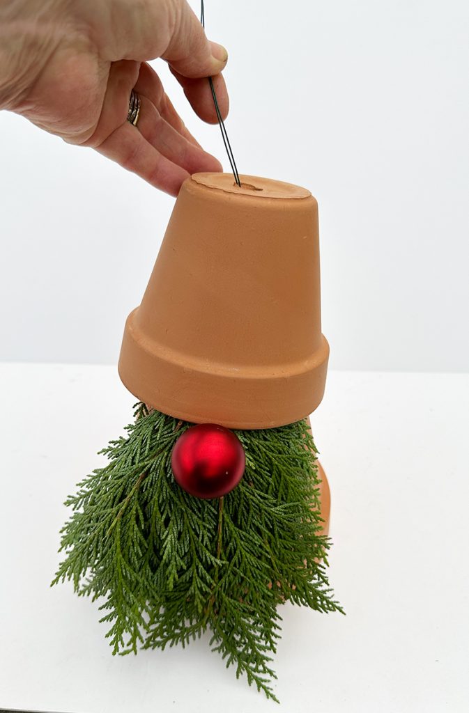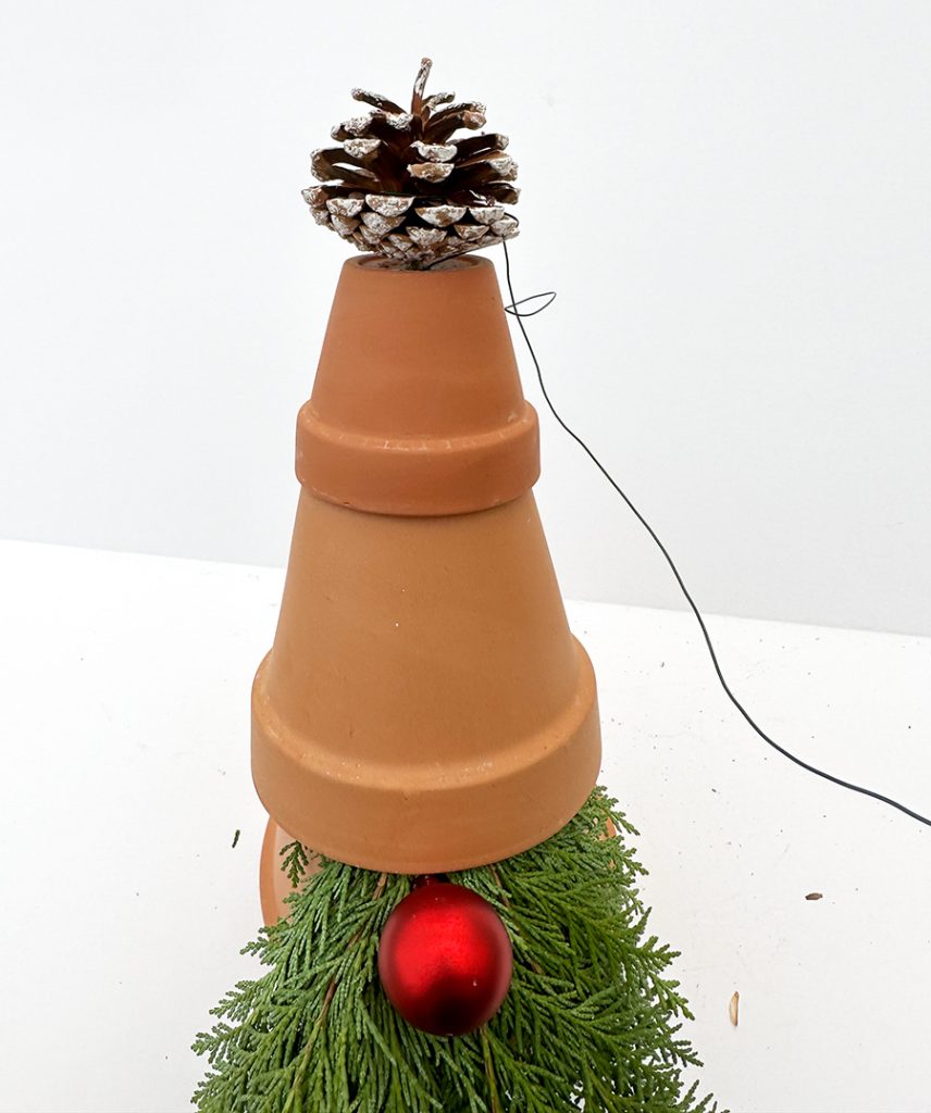 Thread wire up through the hole of pot #1. Wind the wire around a pine cone, again pulling tightly. If needed, tuck some moss in space between cone and top pot.