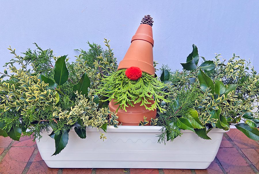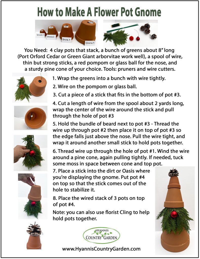 You Need: 4 clay pots that stack, a bunch of greens about 8” long (Port Orford Cedar or Green Giant arborvitae work well), a spool of wire, thin but strong sticks, a red pompom or glass ball for the nose, and