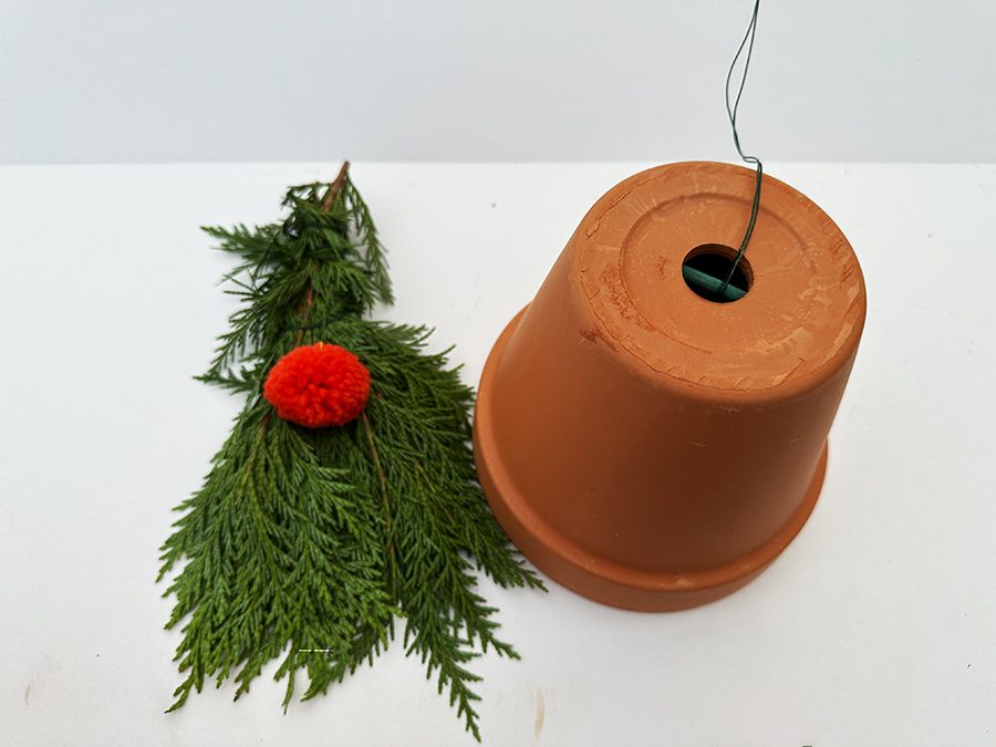 Wrap the greens into a bunch with wire tightly. Attach the red ball with a wire. Then cut a piece of a stick that fits in the bottom of pot #3. See the photo below.